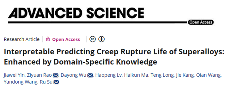 J. Yin, Z. Rao, D. Wu, H. Lv, H. Ma, T. Long, J. Kang, Q. Wang, Y. Wang, R. Su, Interpretable Predicting Creep Rupture Life of Superalloys: Enhanced by Domain-Specific Knowledge. Adv. Sci. 2024, 2307982.
