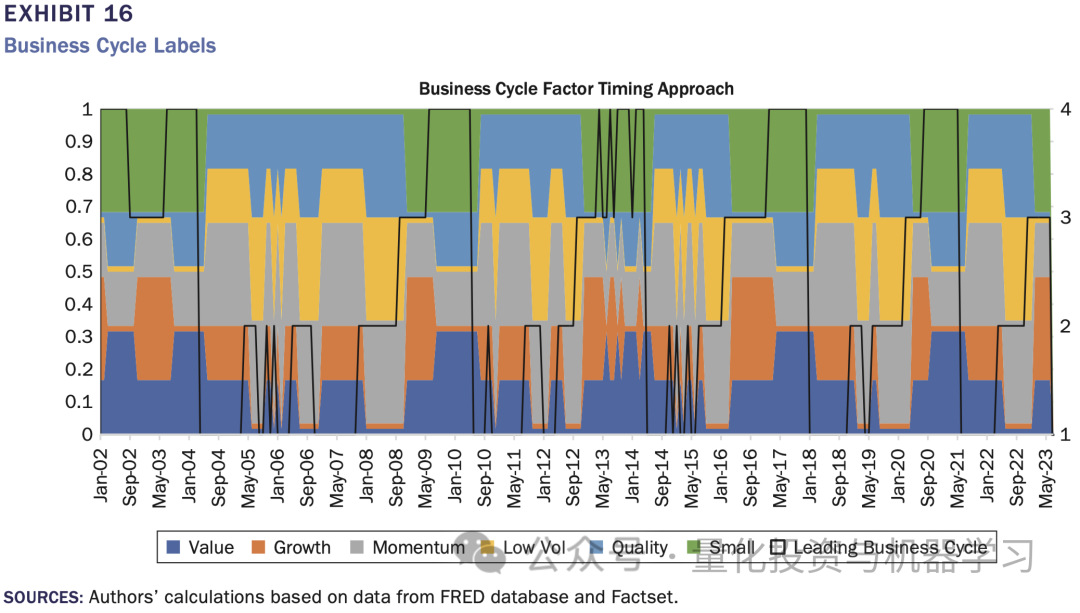 在第一阶段中,我们使用聚类算法将市场风险体制进行分类,得到了不同市场风险体制下的因子表现数据。在第二阶段中,我们使用监督学习技术来预测每个因子在不同市场风险体制下的相对表现。1、将整个数据集分成多个子数据集,每个子数据集对应于第一阶段中识别出的不同市场风险体制。2、对于每个子数据集,我们使用监督学习技术来预测每个因子的相对表现。我们使用了多种监督学习技术,包括随机森林、支持向量机和神经网络等。本文精选了六个常见的股票因子,包括价值、成长、动量、低波动性、质量和小市值。为了简化分析并提高便利性,作者将代表时间周期仅占3.8%的熊市阶段合并到市场修正阶段中。在每个阶段的每个月,对上述6个常见因子的表现最佳的因子标注为1,其他因子标注为0。同样选取阶段1模型的特征,训练有监督的分类模型。3、为了增强模型的动态性,我们采用了滚动窗口模型训练方法,而不是使用扩展窗口。这使得模型能够更好地适应不同的市场条件,并提高因子择时策略的预测能力。最后,我们使用历史数据进行模型的回测测试,以评估模型的性能和有效性。我们使用了等权重因子和仅基于商业周期的方法作为基准(如下图所示),以展示我们的模型相对于其他常见方法的优势。而当使用本文的两阶段机器学习模型时,因子的权重为分类器最后给出的概率。