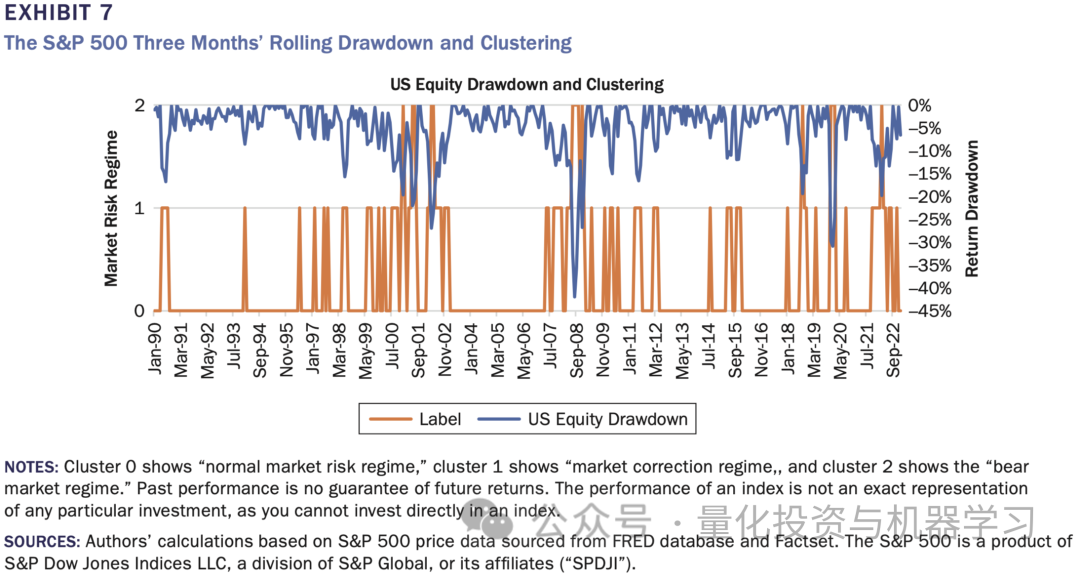 1、市场风险体制预测器:首先,使用K均值聚类算法对S&P 500指数的最大回撤数据进行分类,以识别不同的市场风险体制。这一步骤旨在将市场条件划分为不同的簇,以反映不同的市场风险体制。如下图是标普500滚动3个月的最大回撤数据,我们对下列数据进行聚类分析,根据K-Means聚类的Elbow分析,决定聚为3类,如图7所示。2、三种市场风险体制:在聚类过程之后,基于聚类结果确定的三种特定市场风险体制。其中cluster 0表示正常市场,cluster 1表示修复性反弹市场,cluster 2表示熊市。3、市场风险预测:有了上述市场当前风险体制的标签,可以使用各种监督学习的分类技术对市场风险体制进行分类学习,以预测未来市场的风险体制。监督学习需要X变量,y就是步骤2的聚类标签。本文选取以下特征:除了以上表格中的特征,还定义了一个Financial Turbulence指标,金融动荡的计算方法如下所示:由于大部分时间市场处于正常阶段,所以训练时,采用了过采样技术,如SMOTE,以解决数据不平衡问题,最终最小化了模型的偏差。下图给出了模型预测准确度和特征重要性。在这一阶段,通过聚类和分类技术,识别和预测了不同的市场风险体制,并为第二阶段的因子相对表现预测提供了基础。整体而言,第一阶段的过程旨在为第二阶段的因子相对表现预测提供基础,并为动态因子择时决策提供支持。第二阶段
