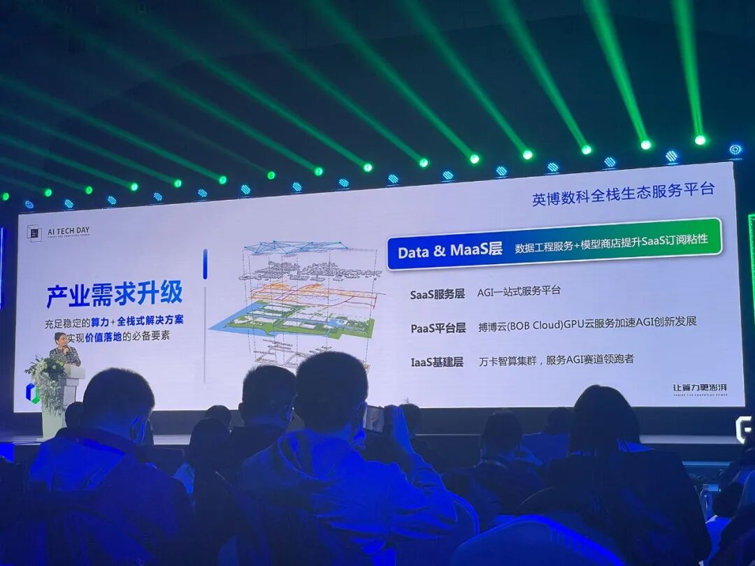 她很清楚,鸿博股份是传统企业出身,做技术研发拼不过互联网大厂,所以英博数科要做“窄、小、深、沉”的事:窄,是大厂不稀罕做的细分领域;小,是一个小团队能够把它跑起来;深,是行业隐形护城河要深;沉,是足够下沉,行业覆盖的足够广,必须是个未来5-10年有发展空间的朝阳产业。以算力出租服务为例,看似生意逻辑简单,怎么以便宜的价格拿货、怎么找到客户……这些隐形护城河其实很高。但单一的算力出租业务不是长久的生存法则。周韡韡意识到,大模型、AI应用接入几乎所有产业的生产加速是必然的,随着对高端算力需求的规模持续增长,这个赛道需要一个能够解决从基建到商业化落地问题的一站式服务平台。因此,英博数科将自身定位升级为:AGI全栈服务商,要形成中国版的App Store(应用商店)+Hugging Face(开源开发者和模型社区)。
