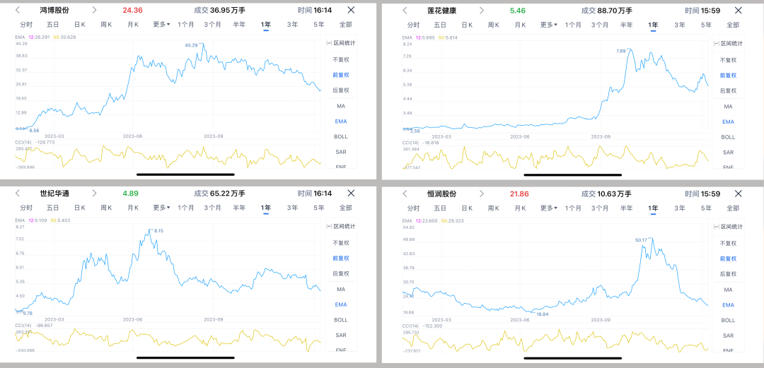 ▲鸿博股份、莲花健康等一年以来的股价变化(图源:腾讯自选股)