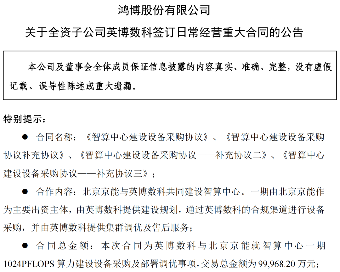 10月,王小川在云栖大会上作为大模型企业代表,透露了阿里云支撑百川智能完成千卡大模型训练任务;没多久,百川智能又为腾讯云背书,联合腾讯云向量数据库搭建基于用户知识库的智能问答演示系统。而后,阿里、腾讯、小米等这科技巨头都参与了百川智能的3亿美元A1融资。在接受媒体采访时,王小川曾谈道,大模型行业训练和推理算力的合计成本占大模型总成本的40%以上。这道出了大模型创企普遍面临的资源压力:在首轮排位赛角逐出胜负之前,大模型训练对算力的渴求没有止境。就当大家还在观望哪家云巨头能拿下更多大模型订单时,12月初,一纸围绕百川智能的云服务协议公告,将业界的视线聚拢到了一家名不见经传的“小公司”英博数科身上。根据鸿博股份12月5日公布的交易合同内容,英博数科将分别在不晚于2024年1月30日、4月30日前分两批交付协议约定的英伟达DGX/HGX H系列智算服务器,涉及总金额13.82亿元。