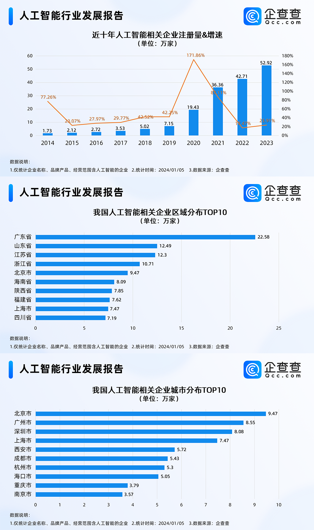 1月8日,企查查大数据研究院发布“2023年度热门产业盘点”。企查查数据显示,我国现存AI相关企业157.18万家。近十年,我国AI相关企业注册量呈持续正增长态势,2020年新增19.43万家,同比增长171.86%,达近十年增速峰值。2021年-2023年,我国AI相关企业分别新增36.36万家、42.71万家、52.92万家,同比增长87.11%、17.47%、23.91%。从区域来看,广东现存22.58万家AI相关企业,位居第一;从城市来看,北京现存9.47万家AI相关企业,位居第一。
