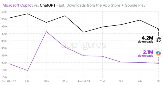 据TechCrunch今日报道,根据应用商店情报提供商Appfigures的数据,微软最近推出的AI聊天机器人Copilot尚未对OpenAI的ChatGPT安装量或收入产生影响。Copilot由OpenAI的DALL-E 3和GPT-4模型驱动,可免费访问,而ChatGPT只免费提供GPT-3.5模型。截至1月5日,Copilot在iOS和安卓上的下载量为210万次,每日下载量峰值为41.3万次,此后有所放缓。美国是Copilot最大的市场,下载量占24%,其次是德国、印度、意大利和英国。