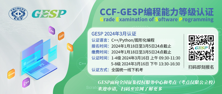 CCF编程能力等级认证,英文名Grade Examination of Software Programming(以下简称GESP),由中国计算机学会发起并主办,是为青少年计算机和编程学习者提供学业能力验证的平台。GESP覆盖中小学全学段,符合条件的青少年均可参加认证。GESP旨在提升青少年计算机和编程教育水平,推广和普及青少年计算机和编程教育。