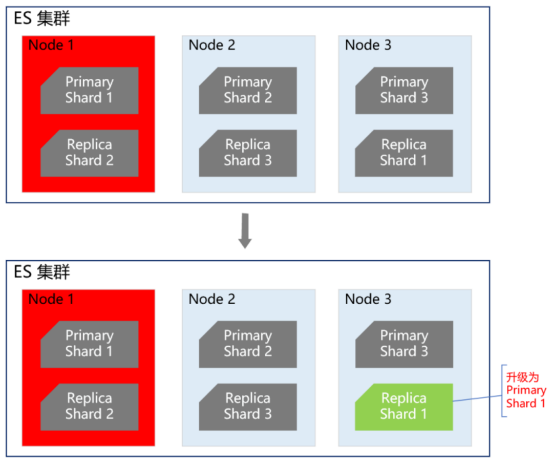 同程和艺龙两家公司融合后,全平台所有体系的会员总量是十多亿。在这么大的数据体量下,业务线的查询维度也比较复杂。有的业务线基于手机号,有的基于微信unionid,也有的基于艺龙卡号等查询会员信息。这么大的数据量,又有这么多的查询维度,基于此,我们选择ES用来存储统一会员关系。ES集群在整个会员系统架构中非常重要,那么如何保证ES的高可用呢?首先我们知道,ES集群本身就是保证高可用的,如下图所示:当ES集群有一个节点宕机了,会将其他节点对应的Replica Shard升级为Primary Shard,继续提供服务。但即使是这样,还远远不够。例如ES集群都部署在机房A,现在机房A突然断电了,怎么办?例如服务器硬件故障,ES集群大部分机器宕机了,怎么办?或者突然有个非常热门的抢购秒杀活动,带来了一波非常大的流量,直接把ES集群打死了,怎么办?面对这些情况,让运维兄弟冲到机房去解决?这个非常不现实,因为会员系统直接影响全公司所有业务线的下单主流程,故障恢复的时间必须非常短,如果需要运维兄弟人工介入,那这个时间就太长了,是绝对不能容忍的。那ES的高可用如何做呢?我们的方案是ES双中心主备集群架构。我们有两个机房,分别是机房A和机房B。我们把ES主集群部署在机房A,把ES备集群部署在机房B。会员系统的读写都在ES主集群,通过MQ将数据同步到ES备集群。此时,如果ES主集群崩了,通过统一配置,将会员系统的读写切到机房B的ES备集群上,这样即使ES主集群挂了,也能在很短的时间内实现故障转移,确保会员系统的稳定运行。最后,等ES主集群故障恢复后,打开开关,将故障期间的数据同步到ES主集群,等数据同步一致后,再将会员系统的读写切到ES主集群。2. ES流量隔离三集群架构