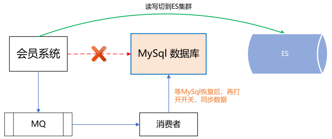 做到这一步,感觉会员主库应该没问题了,可dal组件的一次严重故障改变了我们的想法。那次故障很恐怖,公司很多应用连接不上数据库了,创单量直线往下掉,这让我们意识到,即使数据库是好的,但dal组件异常,依然能让会员系统挂掉。所以,我们再次异构了会员主库的数据源,双写数据到ES,如下所示:如果dal组件故障或MySql数据库挂了,可以把读写切到ES,等MySql恢复了,再把数据同步到MySql,最后把读写再切回到MySql数据库。如下图所示:五、异常会员关系治理