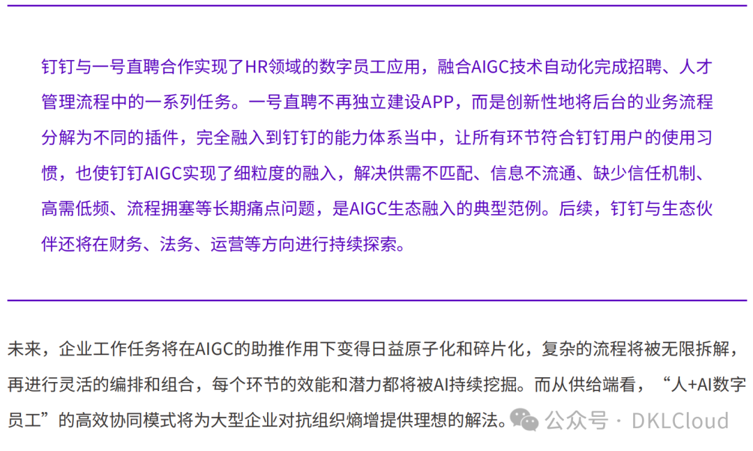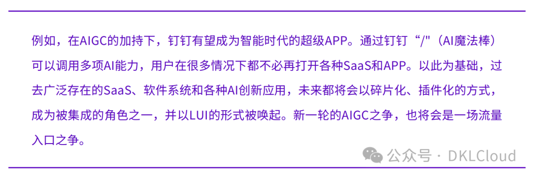 当前,以钉钉为代表的国内AI应用厂商已经在AIGC的应用落地方面做出了有益的尝试,在企业内部推动人机协同、智能决策等先进工作模式的实施,为广大中小企业提供易于使用、功能强大的AI