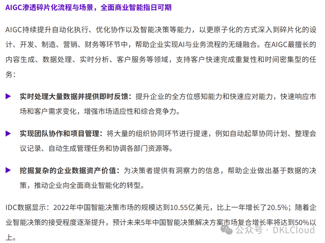 数据层面的利用率持续提升:根据IDC的DataSphere研究,每年企业产生的非结构化数据(内容)数量远远大于结构化数据,然而只有不到5%的数据被用于分析、学习。专属大模型激发了企业使用非结构化数据的想象力。IDC预测,到2025年,数据的复杂性、波动性和资源稀缺性