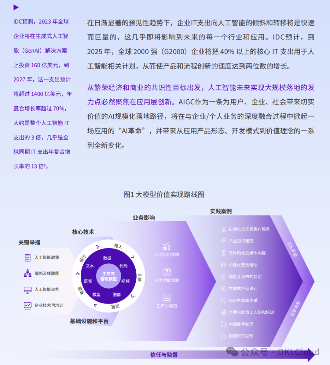 大模型的初步测试和概念验证,24%的中国企业已经在生成式AI方面投入了大量资金 。为了在智能数字业务时代保持竞争力,企业必须开启一次重构之旅。从业务和组织层面,涉及到重新考虑和设计企业的产品服务、业务流程、管理结构及企业文化。从技术层面,需要考虑重构基础设施、业务应用、交互模式、数据价值、生态伙伴。总之,这次重构不仅意味着引入新技术,还包括建立一种以数据和数字工具为核心的运营理念,以及培养一种创新和适应性强的企业文化,以帮助企业更好地利用智能技术,创新产品和服务,最终实现在智能数字业务时代的成功。