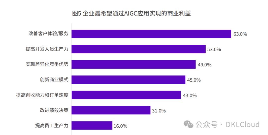 IDC的调研显示,企业当前最希望通过AIGC来实现的商业利益包括:改善客户体验/服务、提高开发人员生产力、实现差异化竞争优势以及创新商业模式等。IDC预测,到 2026 年,GenAI将承担 42%的传统营销琐事,如搜索引擎优化、内容和网站优化、客户数据分析与细分、潜在客户评分和超个性化。
