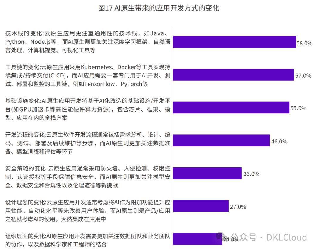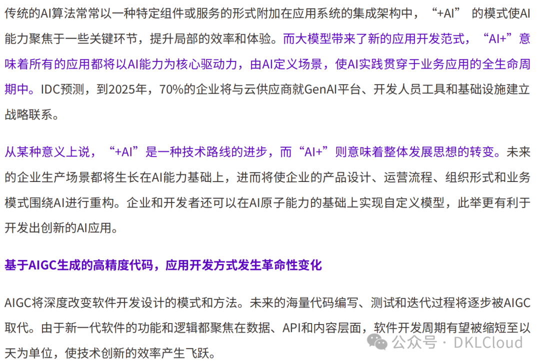 应用迁移上云和基于云原生的重构,是过去一段时期内数字化的主流实践。如今,大模型和AIGC驱动正在重新定义基础设施,AI原生设计思想也正在渗入各行业的应用开发过程中,形成软件开发新范式。IDC的调研表明:企业认为AI原生将带来一系列变革,包括技术栈的变化、工具链的变化、基础设施的变化、开发流程的变化、安全策略的变化、设计理念的变化以及组织层面的变化等。在迈向AI原生的过程中,企业应积极做好准备。