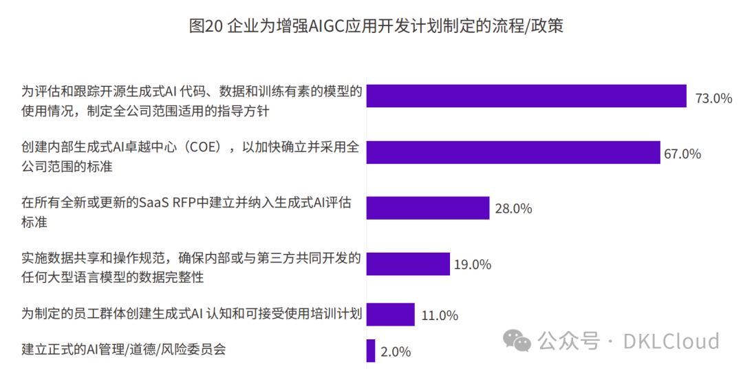 IDC的调研也显示了企业对于AIGC开发和使用规范的重视:73%的企业表示会评估和跟踪开源GenAI代码、数据和预训练模型的使用情况,并制定全公司范围适用的标准规范;67%的企业会考虑创建内部GenAI卓越中心,以加快确立并采用全公司范围的标准。