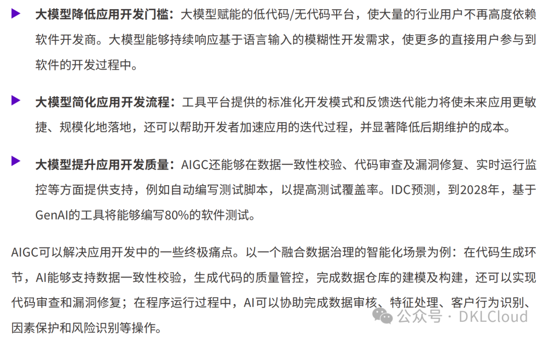 大模型既可以通过日渐活跃的应用创新体系显现出巨大的业务价值,同时也能够显著提升应用软件自身的开发和部署效率,提升已部署应用的准确度。在可预见的一段时期内,随着大模型基础服务的日渐普及,行业用户将加速构建和部署定制化的 AI 应用,实现AIGC技术的多点开花。