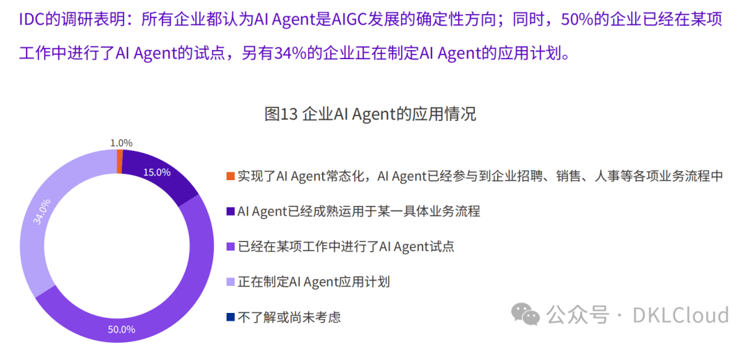 生成式AI正在“听、说、读、写、看、画、思、动”等诸多方面延伸人的能力,行业用户已经开始加速部署。生成式AI正在沿着“智能实习生、个人数字助理、咨询顾问专家、优秀数字员工”方向演进,以钉钉代表的技术厂商推出AI Agent类应用是当前生成式AI落地的一条主流路径,成为多行业用户优先尝试的落地方式。生成式AI正在重塑所有的行业和企业,其应用范围从跨行业应用场景如知识管理、市场营销、客户服务、代码生成、艺术设计等逐渐向行业专属的应用场景过渡,如金融行业的投资策略优化、政府行业的政策模拟与预测、制造行业的产品研发与设计、零售行业的虚拟试衣与产品展示、医疗行业的诊断辅助与医疗建议生成等。IDC调研显示,35%的中国企业正在做