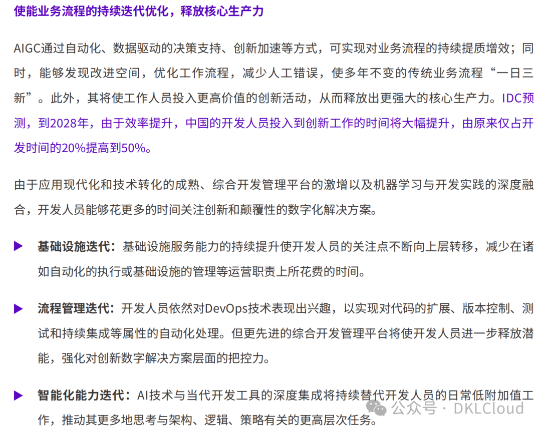垂直领域的数据、面向场景的模型优化以及高效低成本的工程化解决方案是企业利用AI建立竞争优势的关键。未来,包括AIGC和大模型数据开发工作在内的一系列基础工作将变得更加自动化、智能化。IDC预计,到 2025 年,采用 GenAI 驱动的数据智能和集成软件将产生新的自动化数据平台,使数据工程师的生产力至少提高 25%。