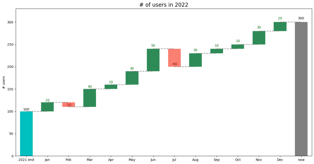瀑布图(Waterfall plots)经常用来展示某个值随时间的累积变化。另外,它们也可以使用固定的类别(例如,特定事件)而不是时间。因此,这种类型的图表在向业务利益相关者展示演示文稿时非常有用,因为我们可以轻松地展示公司营收/客户群随时间的演变。