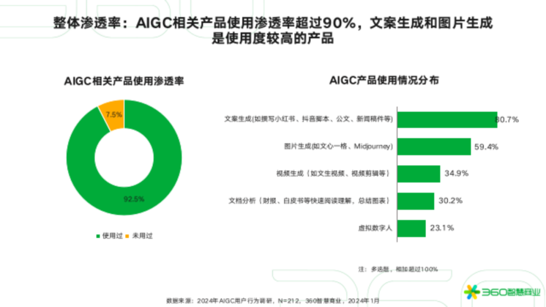 这份由见实团队时隔5个月后追进的调研,一共获得212家企业参与,其中,89家使用 AIGC 产品的B2C企业中,服务(13.5%)、教育(9%)以及美妆(7.9%)成为率先应用的三大行业;而在65家B2B企业中使用AIGC产品的行业分布中,服务(21.53%)、网络(18.5%)、工具(12.3%)和传媒行业(9.2%),服务业成为最多应用 AIGC 工具的行业。报告的撰写和梳理,我们继续借助了AI。这次是由360相关AI团队借助AI工具完成,新报告我们继续更新在了《AI应用需求与付费意愿调研报告》(下称“报告”)。您向见实公众号发送关键词:AI报告,即可获取全文。对的,上份报告发布于5个月前,新报告是在已发布报告基础上做的追进。一路观察下来,最直观的感受是我们正处在一场时代大变革之中,如同“PC互联网”转向“移动互联网”那样,但又有略微不同,这场变革机会和焦虑参半,市场出奇的冷静和理智。根据调研数据显示,AIGC产品在市场上的使用渗透率高达92.5%,这表明大多数企业已经不再处于尝试新产品的阶段,而是全面采用AIGC产品。而这些用户主要分布在服务、网络、教育、传媒、百货等行业中。