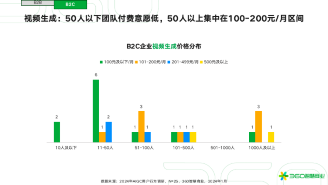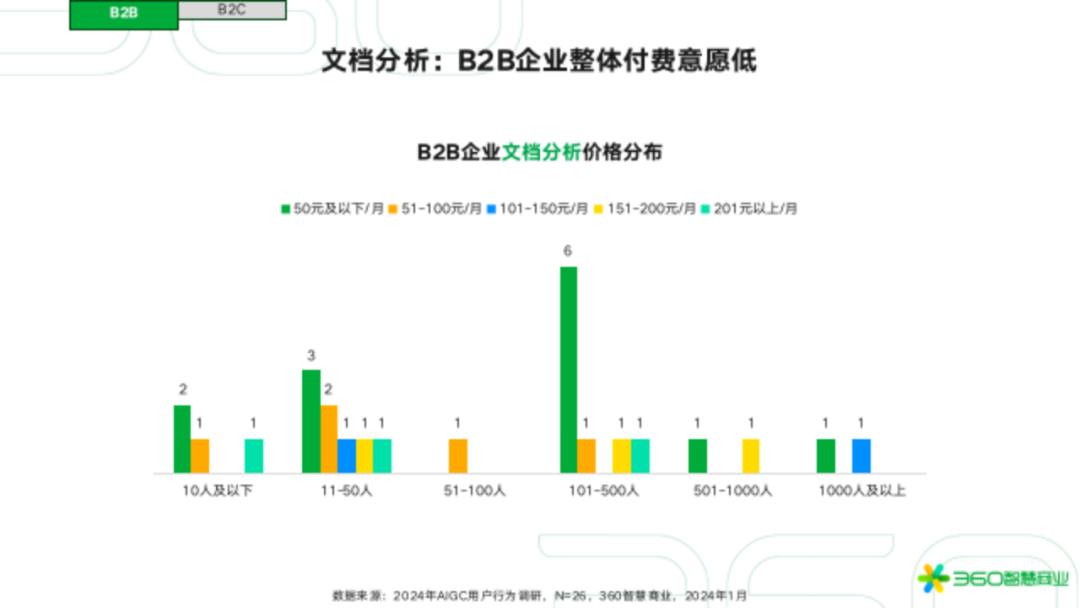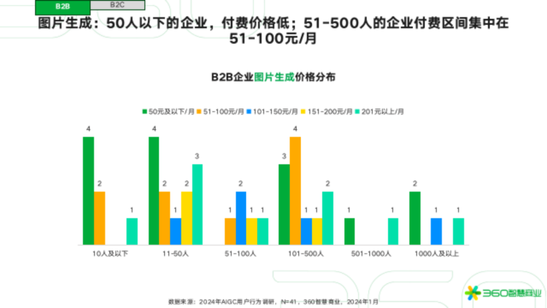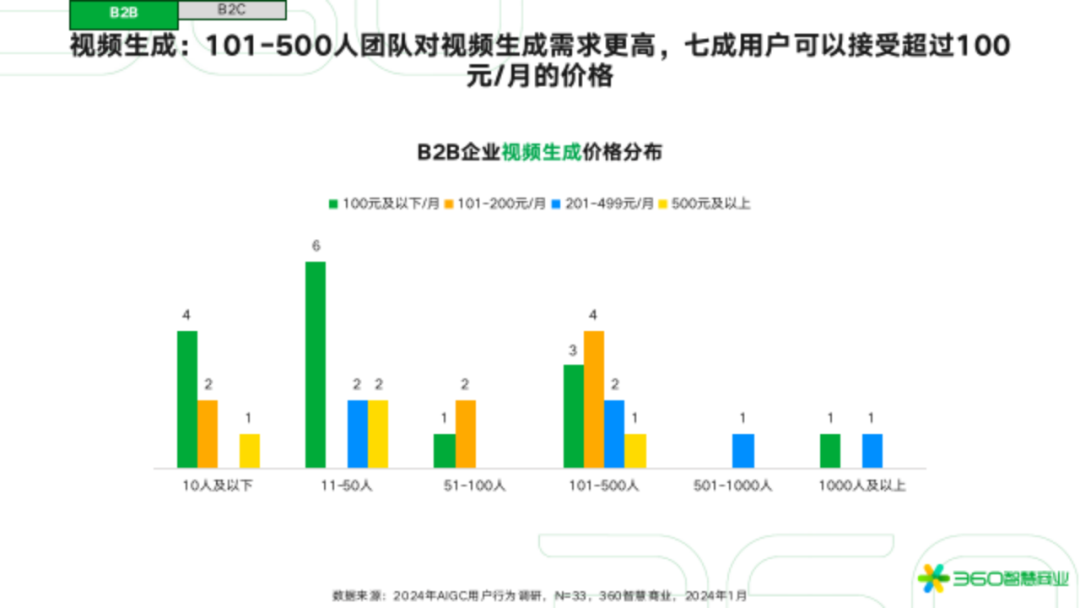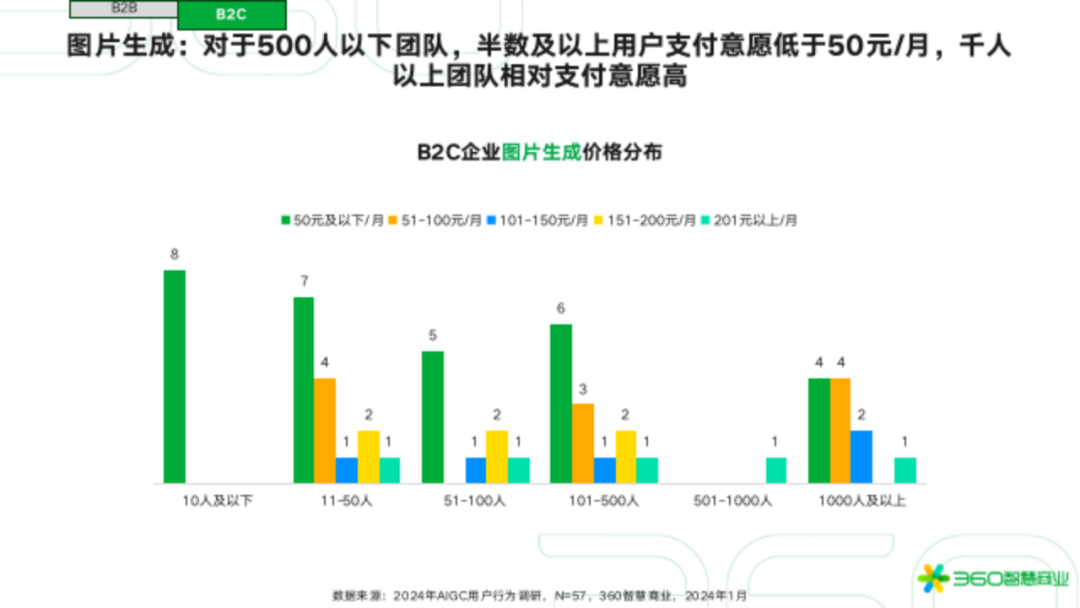 见实展开为期一周、回收了325份的有效问卷中,CEO/总裁这一层级占到21.23%,总监占到了16.92%,部门经理级占到了24.31%,这个比例之均衡,让我们有些惊讶,显示出几乎是所有层级都在对AI表示出非常高的关注度。但最终的《报告》显示:企业的付费比例不变,但愿意支付的费用却在快速降低!对于B2C企业而言,文案生成产品的付费意愿几乎可以说是微乎其微,超过一半的用户对付费金额的接受度都不超过每月100元。对于图片生成产品,付费意愿与企业规模有较大关联,500人以下的团队支付意愿较低,而在500人以上的团队中,付费意愿更高。至于视频生成产品,则是50人以下团队的付费意愿较低,而50人以上团队则集中在每月100-200元的价格区间。对于文档分析和数字人产品,对于千人以上的企业来说具有一定的商业价值,尤其是数字人产品,由于其高单价,企业对价格的敏感度较高。 对于B2B企业而言,各产品的付费意愿没有明显特征,但也显示出一些趋势。例如,对于文案生成产品,付费意愿较低,超过一半的用户可接受的付费金额也不超过每月100元。而图片生成产品在企业规模不同的情况下,付费价格有所不同,但大致在每月51-100元的区间内。而视频生成产品在101-500人团队中的需求较高,大约有七成的用户可以接受每月超过100元的价格;至于文档分析产品和数字人产品,在整体上显示出较低的付费意愿。