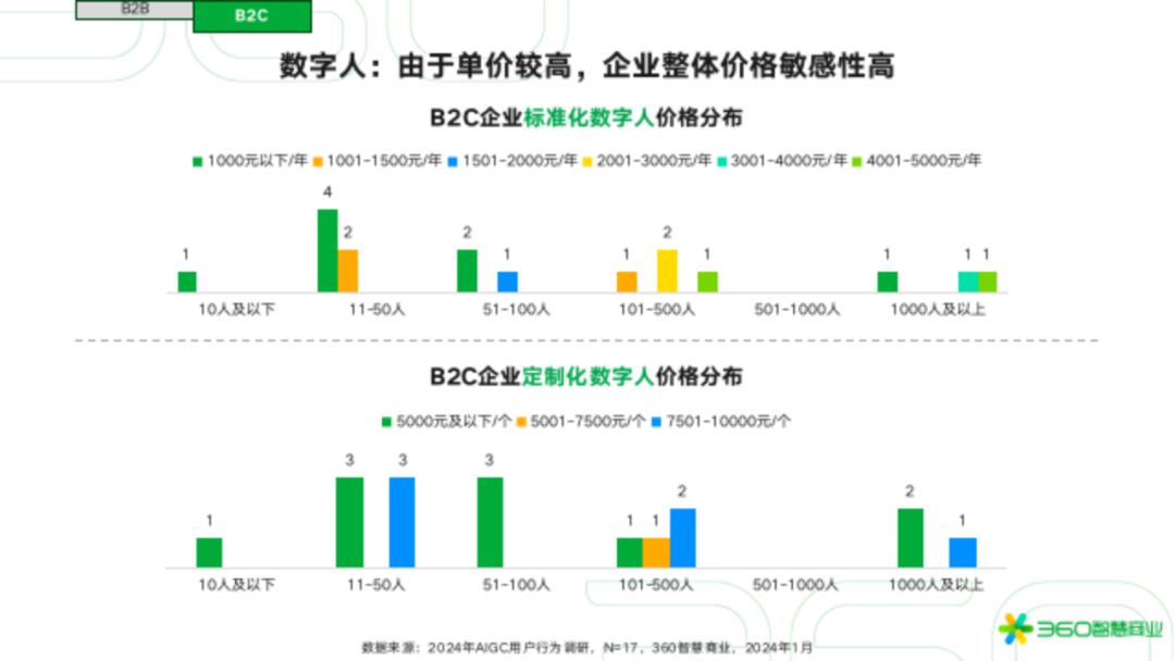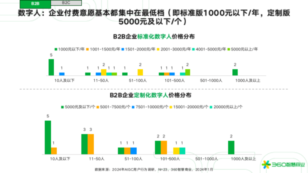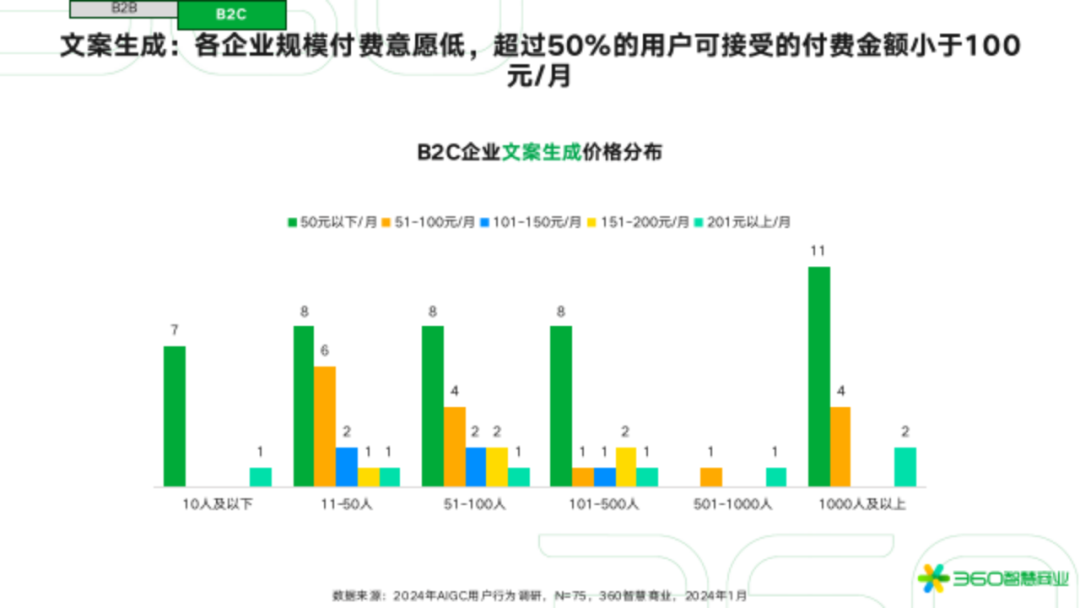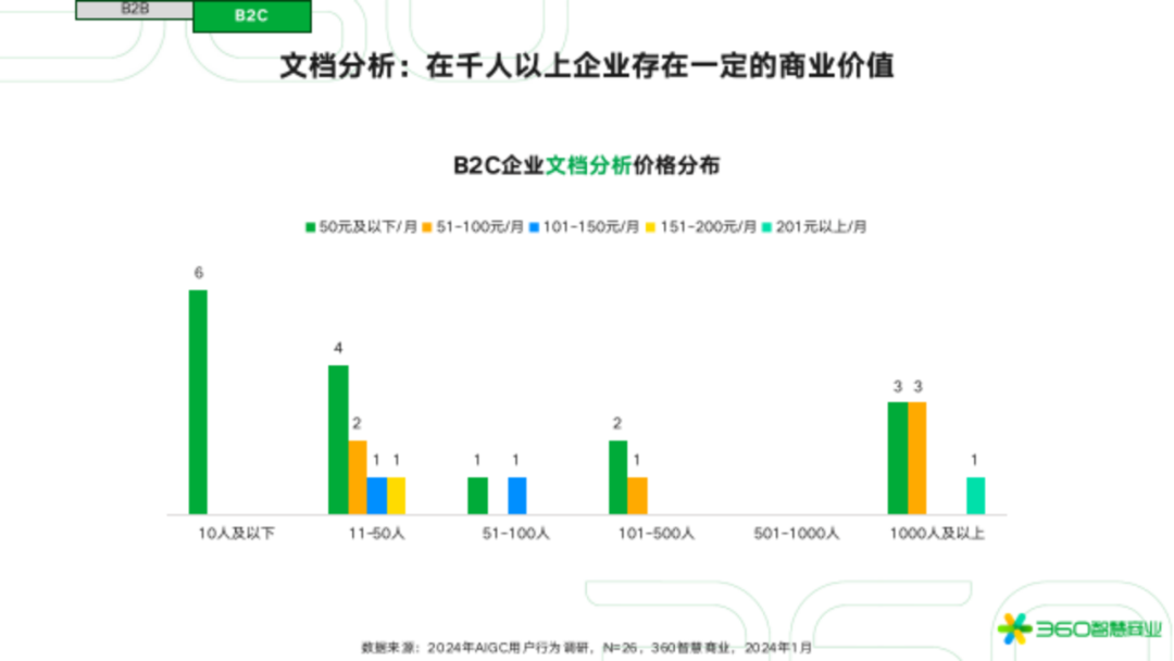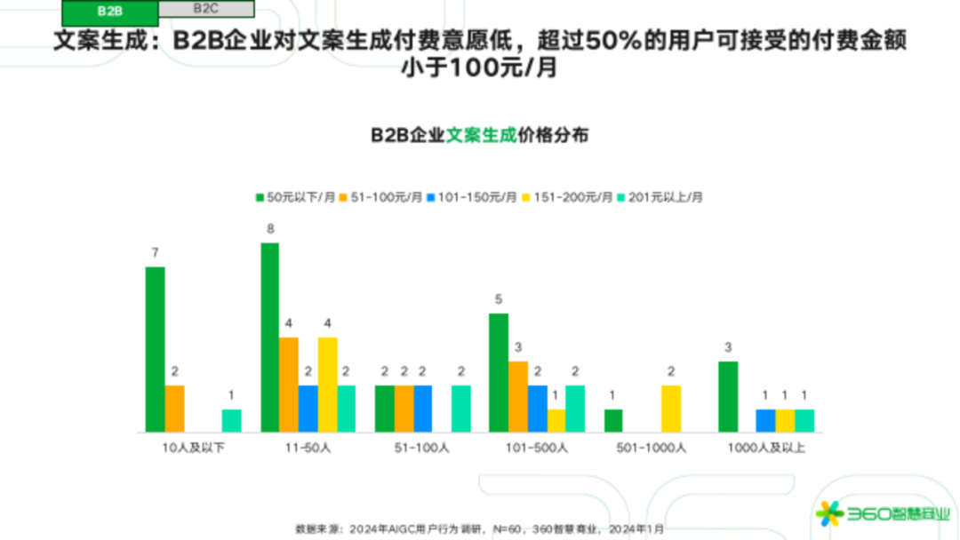 见实展开为期一周、回收了325份的有效问卷中,CEO/总裁这一层级占到21.23%,总监占到了16.92%,部门经理级占到了24.31%,这个比例之均衡,让我们有些惊讶,显示出几乎是所有层级都在对AI表示出非常高的关注度。但最终的《报告》显示:企业的付费比例不变,但愿意支付的费用却在快速降低!对于B2C企业而言,文案生成产品的付费意愿几乎可以说是微乎其微,超过一半的用户对付费金额的接受度都不超过每月100元。对于图片生成产品,付费意愿与企业规模有较大关联,500人以下的团队支付意愿较低,而在500人以上的团队中,付费意愿更高。至于视频生成产品,则是50人以下团队的付费意愿较低,而50人以上团队则集中在每月100-200元的价格区间。对于文档分析和数字人产品,对于千人以上的企业来说具有一定的商业价值,尤其是数字人产品,由于其高单价,企业对价格的敏感度较高。 对于B2B企业而言,各产品的付费意愿没有明显特征,但也显示出一些趋势。例如,对于文案生成产品,付费意愿较低,超过一半的用户可接受的付费金额也不超过每月100元。而图片生成产品在企业规模不同的情况下,付费价格有所不同,但大致在每月51-100元的区间内。而视频生成产品在101-500人团队中的需求较高,大约有七成的用户可以接受每月超过100元的价格;至于文档分析产品和数字人产品,在整体上显示出较低的付费意愿。