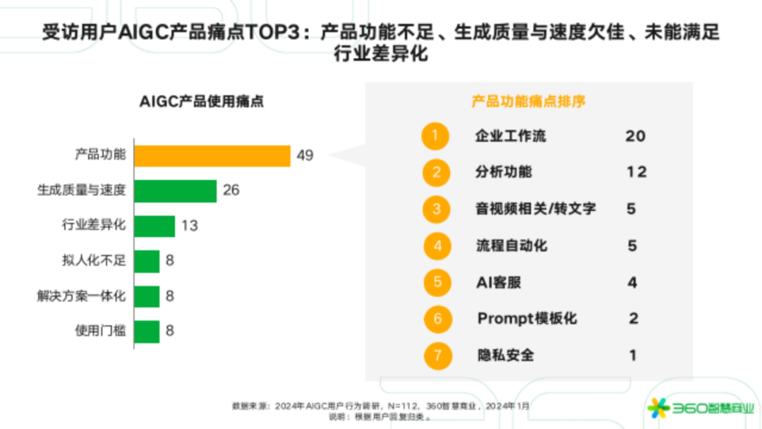 产品功能维度:用户期望改善的TOP3功能为企业工作流、分析功能(如市场分析、竞品分析、产品卖点分析等资讯与数据分析)及音视频相关功能(包括视频生成)。生成质量与速度维度:用户认为产出内容质量有限,达不到商用门槛。行业差异化维度:希望加强特定行业的知识库的储备,打造更适配行业的模型/产品。拟人化维度:文生文、文生图、文生视频都存在不够自然、不够人性化的问题。方案一体化维度:单点功能整合,如文-图-视频一体,一站式解决方案。使用门槛维度:期待更简洁、智能、好操作的产品,部署速度快,员工好上手。