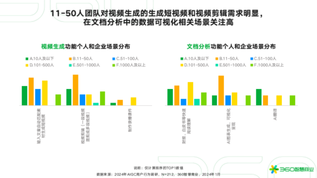 在调研期间,我们还发现一个有趣的现象,如果按照企业规模来做AIGC的偏好分析,我们会发现:11-50人团队最为活跃。11-50人团队的需求集中在海报制作、文案配图和定制化数字人三大功能,包括但不限于在营销视频、企业IP、直播带货以及录制课件等场景方面的需求。同时,他们在公众号、抖音脚本和小红书文案场景均有需求,其中,对视频生成的生成短视频和视频剪辑需求明显, 在文档分析中的数据可视化相关场景关注高。