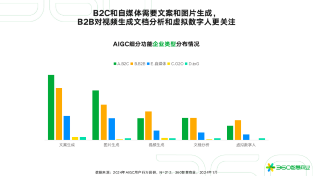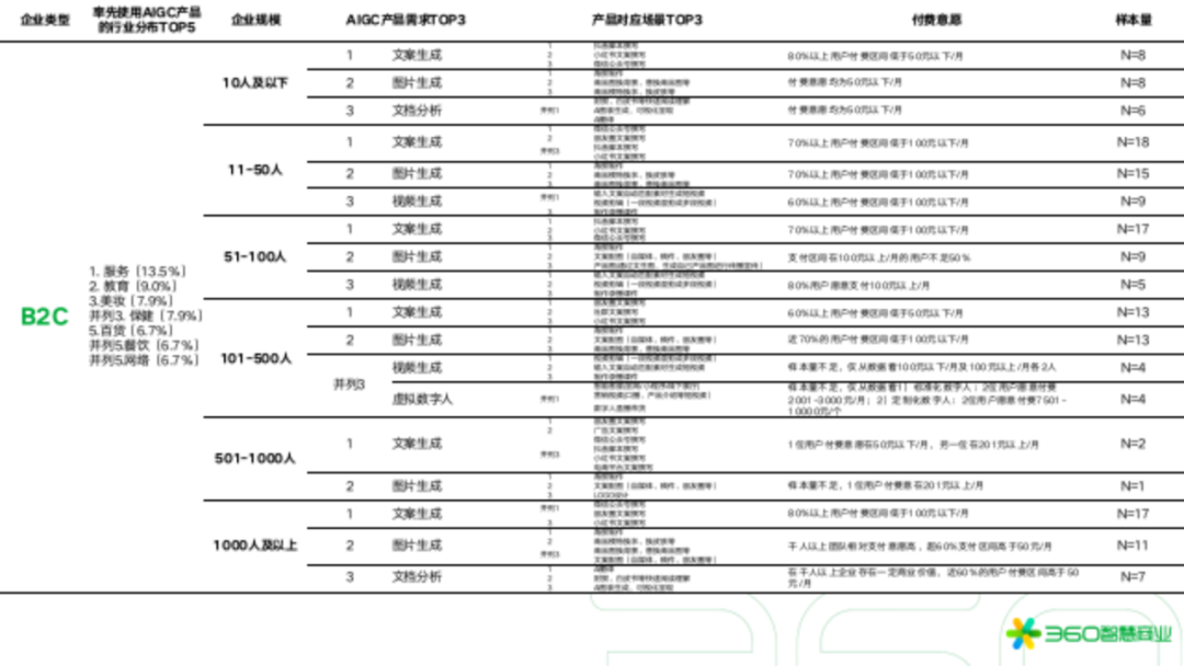 “雷声大,雨点小”是对当前国内AIGC市场最真实的反馈。正如《AI应用需求与付费意愿调研报告》开篇第一句说的那样:左边是大机会,右边是大焦虑。我们仍然能看到 AIGC在办公效率提升方面的卓越表现,具体到各类产品上包括:文案生成、图片生成、文档分析、视频生成和数字人五大AI 产品功能。对于B2C企业,10人以下团队和千人以上团队最常使用的产品是文案生成、图片生成和文档分析;而11-100人团队则主要使用文案生成、图片生成和视频生成;而对于B2B企业来说,500人以下的企业主要需求文案生成、图片生成和视频生成,而在501-1000人团队中,则更多地使用文案生成、图片生成和文档分析产品。一是,视频生成的主要需求包括场景式视频剪辑和课件录制,而文档分析在各种场景下都有需求。在文案生成方面,主要场景包括公众号、抖音脚本和小红书文案,而在图片生成方面,主要需求为海报制作、文案配图和商品图换背景。至于视频生成,则主要是输入文案自动匹配素材生成短视频和视频剪辑。二是,在数字人服务方面,标准化数字人的付费意愿在千元以下和2000-3000元两个价格区间之间,而定制化数字人则可接受5000-10000元的价格区间。数字人的使用场景主要涵盖营销视频、智能客服、直播带货和录播课件等领域。对于数字人服务,拥有11-50人团队的企业可以接受标准化数字人的价格在千元以下,而定制化数字人的价格则可以接受在万元以下。这些企业在营销视频、企业IP、直播带货和录制课件等场景下都有需求。三是,B2C企业需要的功能主要是文案生成和图片生成,价格一般在百元以下每月。文案生成的主要场景包括微信公众号、朋友圈文案和抖音脚本,而图片生成则主要用于海报制作、文案配图和商品模特换装等场景;B2B企业需要的功能主要包括视频生成和文档分析,他们可以接受每月超过百元的价格。视频生成的主要场景包括输入文案匹配素材生成短视频、视频剪辑和录制课件,而文档分析则主要用于财报和白皮书的阅读理解以及AI翻译等方面。此外,B2B企业对数字人的需求也相当明显,其中标准化数字人的价格大约在3000元/年,而定制化数字人的价格则在5000元以下或5000-7500元之间。数字人的具体需求场景包括智能客服、营销视频和录制课件等。四是,自媒体企业主要需要的功能也是文案生成和图片生成,价格也在百元以下每月。文案生成的需求场景主要包括微信公众号、抖音脚本和小红书文案,而图片生成则主要用于海报制作、文案配图和产品图换背景等方面。五是,拥有11-50人团队的企业对AIGC各方面的功能都有需求。文案生成和图片生成的价格在百元以下每月,而视频生成和文档分析的价格则可以超过百元。对于B2C和 B2B企业而言,各企业规模付费意愿均偏低,超50%用户可接受的付费金额小于100元/月。二是,图片生成的付费意愿。海报制作、商品模板换皮肤、商品换背景、LOGO 设计、产品图生成以及文案配图等。B2C企业,对于500人以下团队而言,半数及以上用户支付意愿低于50元/月,千人及以上团队支付意愿相对较高。B2B企业,50 人以下的企业,付费价格低;51-500人的企业付费取件集中在 100 元以内。三是,视频生成的付费意愿。AI在视频生成中常见应用场景包括输入文案自动匹配素材生成短视频、视频剪辑以及制作录音课件等等。对于B2C企业而言,50人以下团队付费意愿低,50人以上集中在100-200元/月区间;对于B2B企业而言,101-500人团队对视频生成需求更高,七成用户可以接受超过 100 元/月的价格。四是,文档生成的付费意愿。AI在文档生成中常见应用场景包括财报、白皮书等快速阅读理解、AI图标生成、可视化呈现以及AI 翻译等等。对于B2C企业而言,在千人以上企业存在一定的商业价值;对于B2B企业而言,几乎没有付费意愿。五是,数字人的付费意愿。AI在数字人中常见应用场景包括智能客服、营销视觉、录制课程课件、数字人直播带货以及企业IP形象打造等。对于B2C和 B2B企业而言,由于客单价较高,企业的整体付费意愿都普遍偏低。