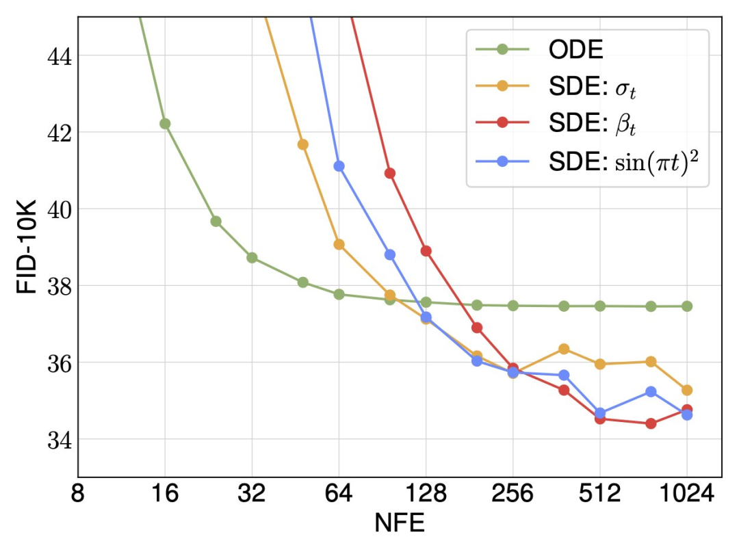 对于随机采样,研究者表明扩散系数不需要在训练和采样之间绑定,在推理时间方面可以有很多选择。同时确定性和随机采样器在不同的计算预算下各有其优势。
