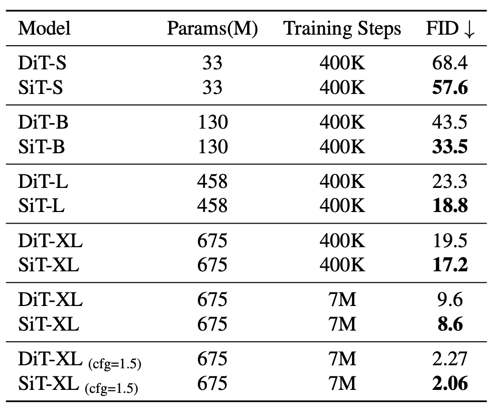 他们通过设计空间中的一系列正交步骤,逐渐地从 DiT 模型过渡到 SiT 模型来解答这一问题。同时仔细评估了每个远离扩散模型的举措对性能的影响。