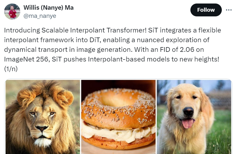 谢赛宁表示,SiT 超越了标准扩散并通过插值来探索更广阔的设计空间。