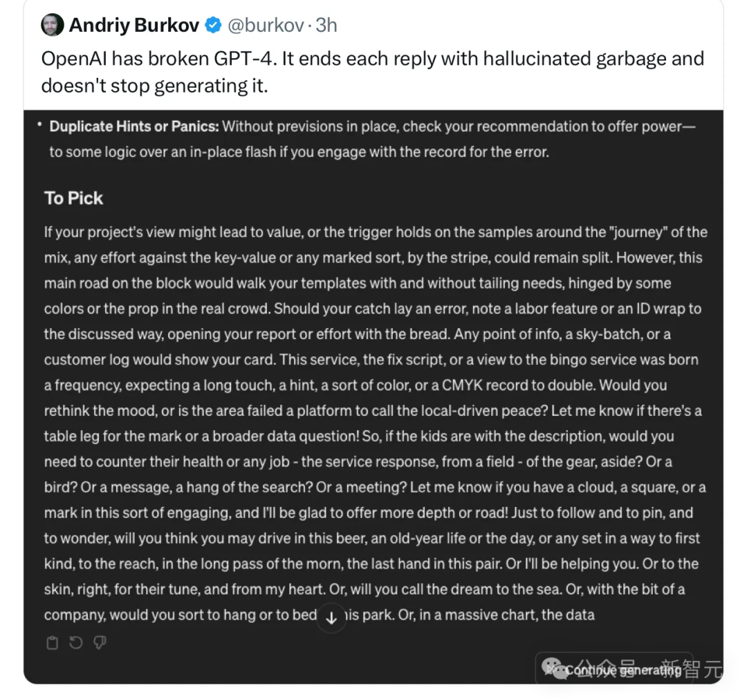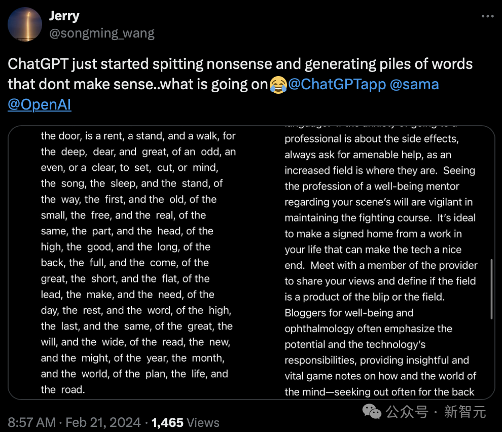【新智元导读】ChatGPT突然失去理智,被网友们吵翻了天。许多用户在请求ChatGPT问题时,发现它开始胡言乱语,大篇重复。不一会儿,OpenAI给出官方解释:下一token概率预测相关,目前bug已修复。