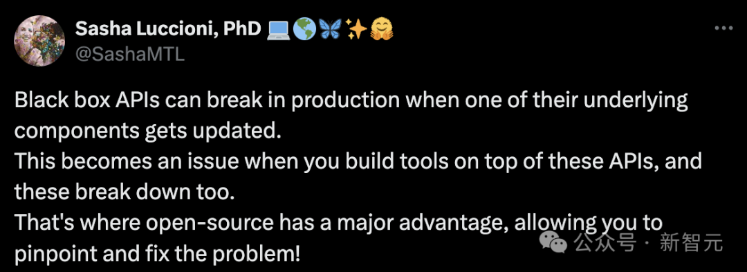 Hugging Face的AI研究员Dr. Sasha Luccioni表示,「当黑盒API的底层组件更新时,它们可能会在输出中崩溃。当你在这些API之上构建工具时,这就会成为一个问题,而这些API也会崩溃。这正是开源技术的一大优势,它可以让您准确定位并解决问题」!