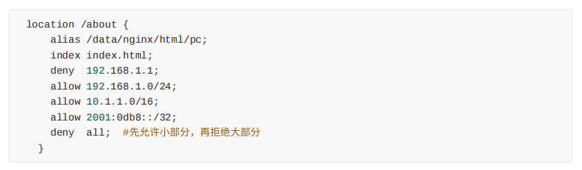 访问控制基于模块ngx_http_access_module实现,可以通过匹配客⼾端源IP地址进⾏限制。