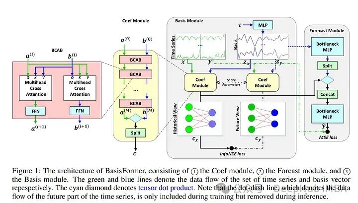 BasisFormer使用可学习和可解释的“basis”来改进一般的transformer 体系结构。这里的“basis”指的是创建一个类似于NBeats的神经“basis”(例如,为基于多项式的函数学习趋势、季节性等的系数)。该模型分为三个部分:基础模块、系数模块和预测模块。基模块试图以自监督的方式确定一组适用于历史和未来时间序列数据的数据基础趋势。basis模块通过对比学习和一个名为InfoNCE loss的特定损失函数(该函数试图学习未来和过去时间序列之间的联系)。coef模型试图“模拟时间序列和一组基础趋势之间的相似性”。对于coef模型,作者使用了一个交叉注意力模块,该模块将basis和时间序列作为输入。然后将输出输入到包含多个MLP的预测模块中。