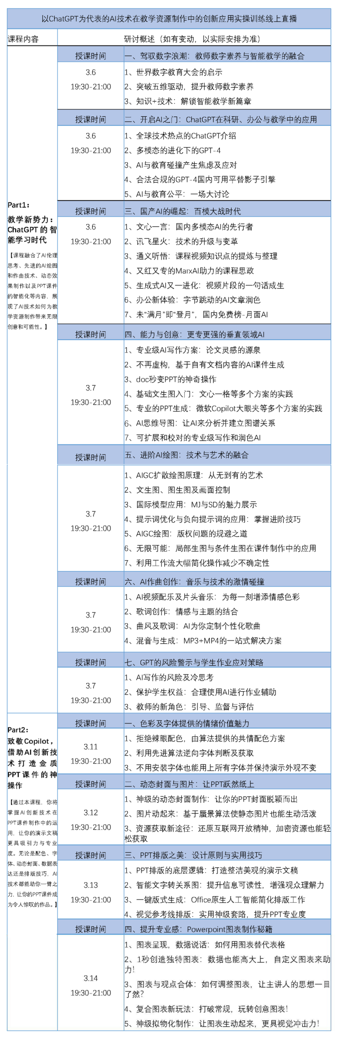 为助力各位老师始终站在科技前沿,快速掌握AIGC在科研领域的运用,我们计划于2024年3月6-14日在线上举办“以ChatGPT为代表的AI技术在教学资源制作中的创新应用实操训练线上直播”