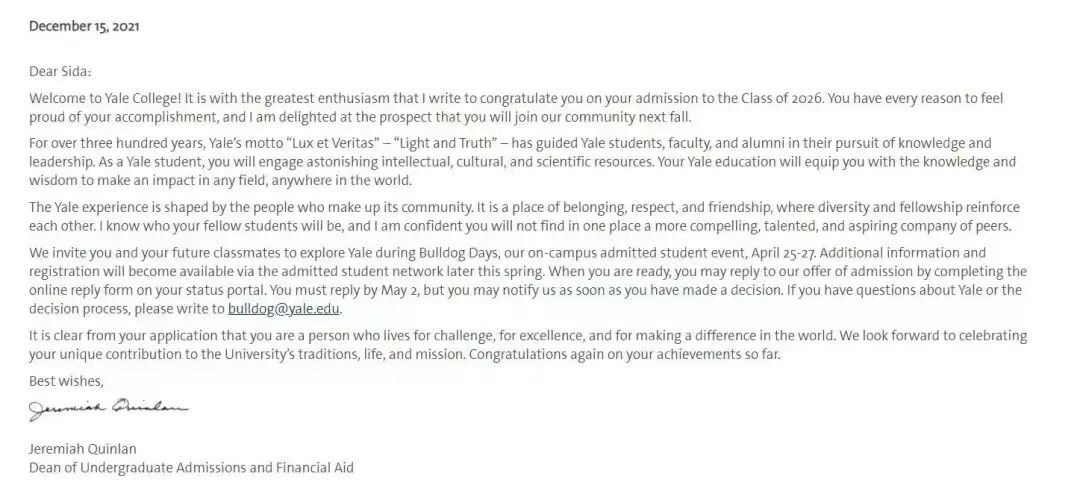 陈思达的耶鲁录取通知书