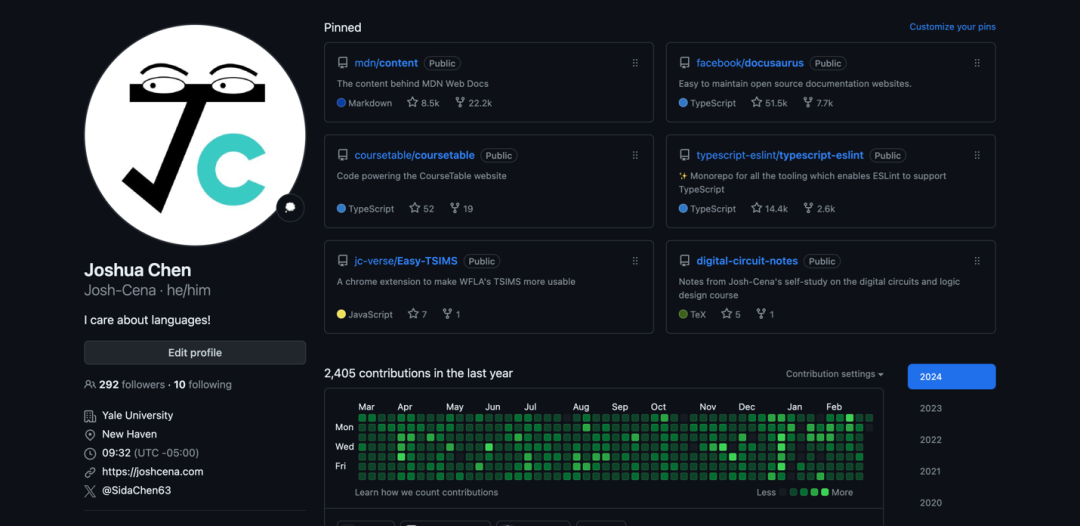 陈思达也没有放弃开源,他还在维护Docusaurus,同时,他又成为了typescript-eslint(代码检查)和MDN docs(web 技术文档)的维护者。在耶鲁大学,他又成为风靡校园的选课平台的主维护者,为其开发了不少功能,并大大改进了历届成员留下的代码的质量。该平台如今月访问量超五百万次,受到所有学生和教授的欢迎。