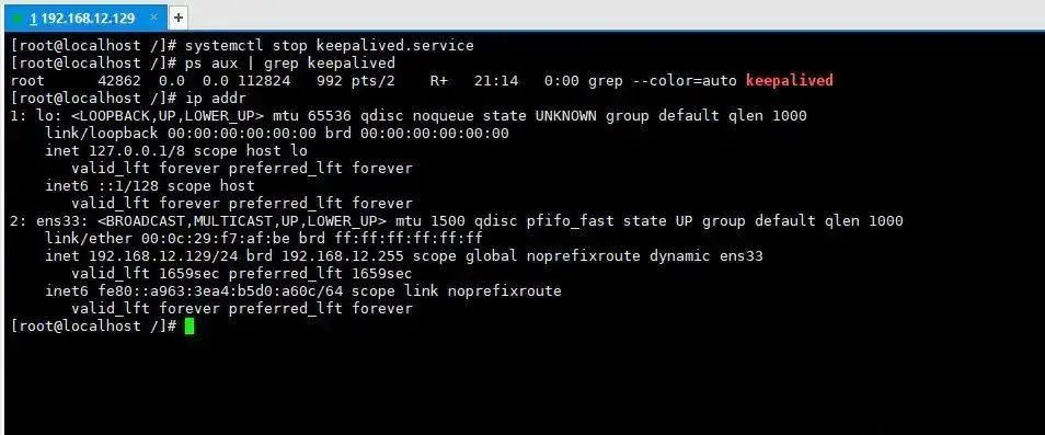 在上述过程中,我们通过手动关闭keepalived服务模拟了机器断电、硬件损坏等情况(因为机器断电等情况=主机中的keepalived进程消失),然后再次查询了一下本机的IP信息,很明显会看到VIP消失了!