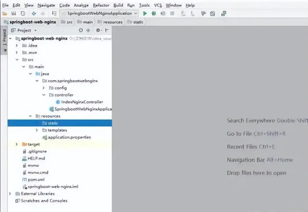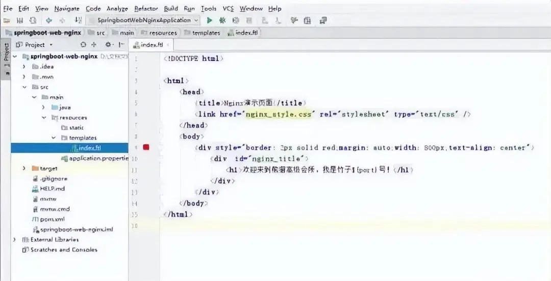 首先通过SpringBoot+Freemarker快速搭建一个WEB项目:springboot-web-nginx,然后在该项目中,创建一个IndexNginxController.java文件,逻辑如下: