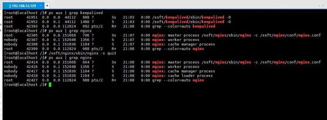 在上述过程中,首先分别启动了keepalived、nginx服务,然后通过手动停止nginx的方式模拟了Nginx宕机情况,过了片刻后再次查询后台进程,我们会发现nginx依旧存活。
