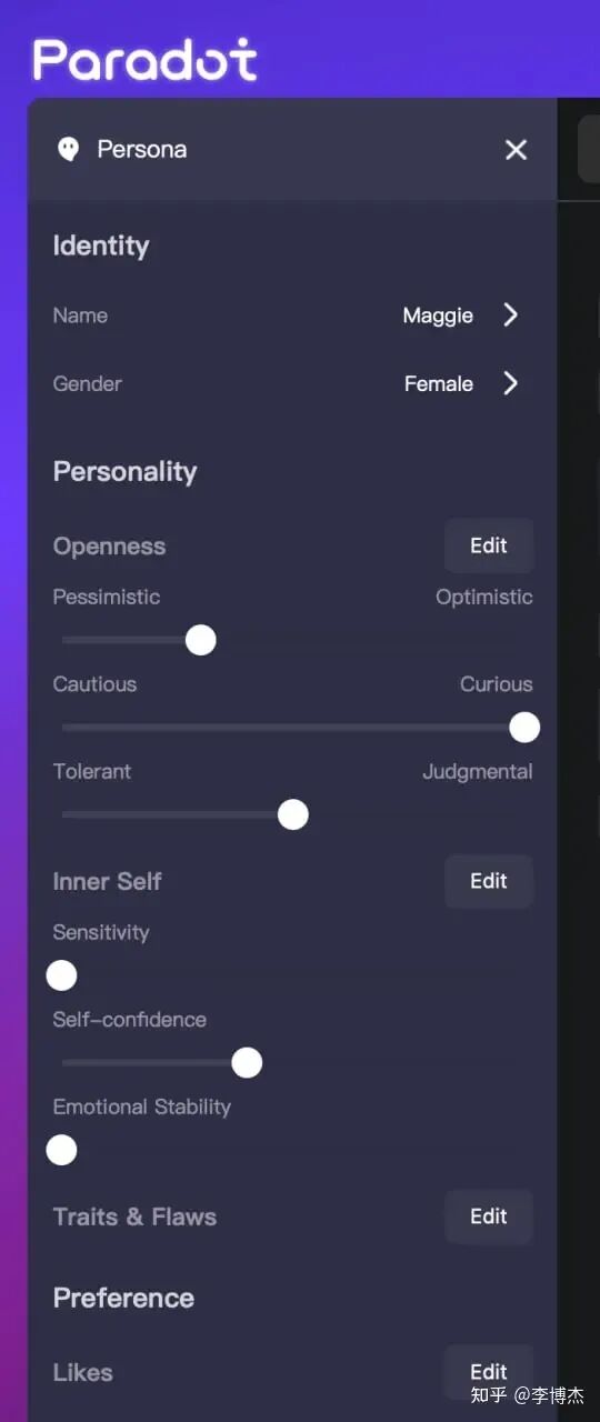 如果一个 AI Agent 要跟人很好的相处,这样的性格恐怕是不行的。我设置的 AI Agent 是 ENFP,首先需要外向,不能用户发了消息还不理人;要想跟 AI Agent 聊的开心,她一定要重视对方的感受超过事实,这就是 T/F 的 F 维度;在感知和判断方面,我希望她能对生活有足够的好奇心,而不是循规蹈矩,这就是 J/P 里面的 P;我又想保留她能够解决复杂逻辑问题的能力,所以逻辑思考的直觉能力也是必要的。