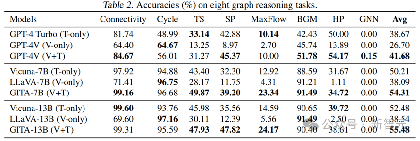 对于开源模型(7B,13B),同样地,使用双模态数据训练出的GITA模型平均表现最佳。这些观察结果验证了同时使用视觉和文本信息能够增强模型的图推理能力,相比单模态模型可以实现更好的性能。