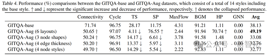 具体来说,模型在布局增强集上取得了优异的结果,比GITQA-Base集高出11%以上。相比之下,其他增广集中八个任务的平均结果比基本集低约5%