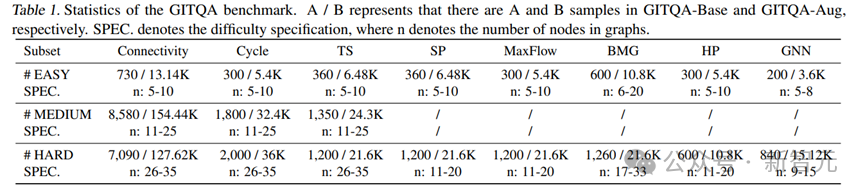 每个任务所对应的数据集都被按照图结构的复杂程度被划分为不同难度等级的子集(相关统计如表1)。