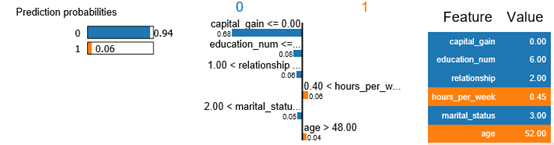 上图给我们解释了对于一个样本的预测结果,是哪些特征决定样本被分类到类别0,哪些特征决定样本被分类到类别1,且具体列出样本在这些特征的数值大小。很直观和明确的解释为什么模型做这个决定。