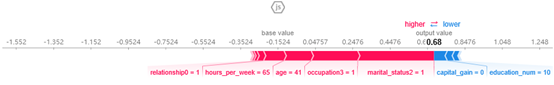 通俗理解:个人影响=个人合作贡献,减去其它 N-1 个人的贡献。 下面还是以收入水平数据集进行案例分析: row_to_show = 5 data_for_prediction = X_test.iloc[row_to_show] # use 5 row of data here. Could use multiple rows if desired data_for_prediction_array = data_for_prediction.values.reshape(1 , -1 )# 计算model的shap值 explainer = shap.TreeExplainer(model)# 计算样本数据的shap值 shap_values = explainer.shap_values(data_for_prediction) shap.initjs() shap.force_plot(explainer.expected_value[1 ], shap_values[1 ], data_for_prediction)