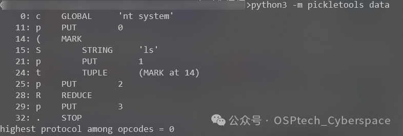 前面说到 protocol = 0 时 pickle code 是可读的,也可以手动构造pickle code