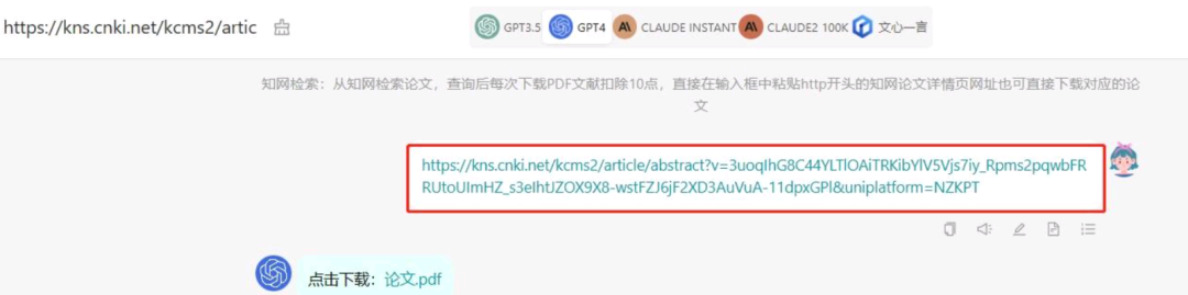 如果搜索关键词找不到你想要的文章,也可以在知网先搜索到目标文章,再将链接粘贴到ChatGPT下载即可。