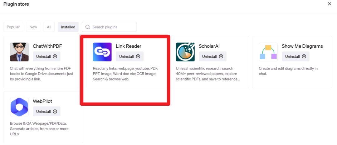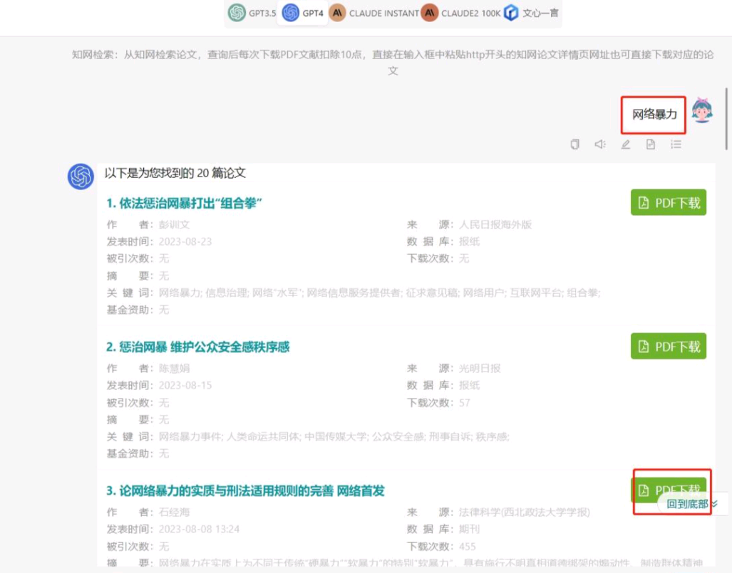 当然了,以上工作都是3.5版本做的,而4.0版本能做的就更多了,比如说接入Bing搜索引擎、使用plugin store插件,特别是Link Reader插件,很好用!此外,ChatGPT还能帮忙下载收费的论文,这里以4.0版本下载知网文献为例: