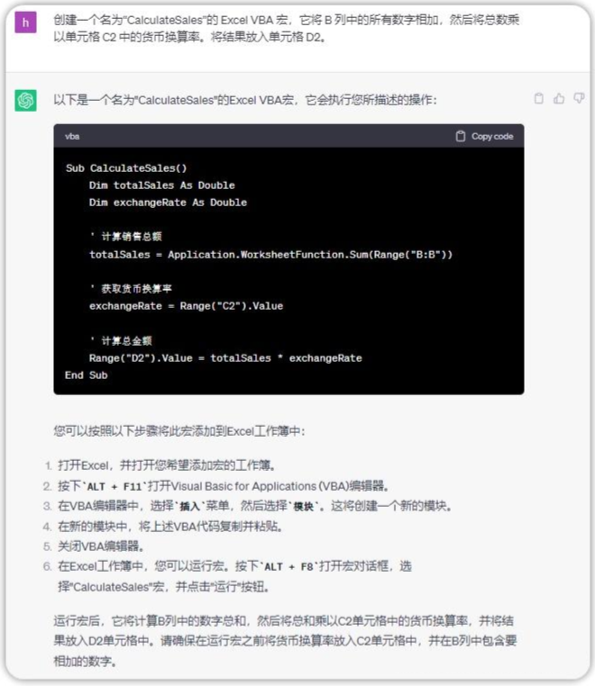 让它帮我们写一个名为“XXX”的宏,将第X列数据相加,其总数乘以单元格XX中的数字,结果呈现在XX格,然后把写好的宏复制到Excel里面即可。只要告诉ChatGPT我们需要的具体帮助或任务,无论是Excel的基本操作、公式的使用,还是更高级的VBA编程,它都能为我们提供指导和解决方案。